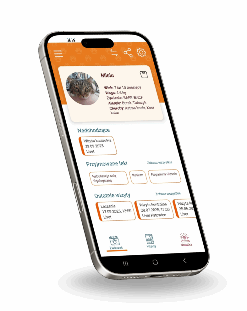 Rejestruj wizyty u weterynarza, zapisuj zalecenia, dołączaj wyniki badań i miej wszystko w jednym, bezpiecznym miejscu – dostępnym 24/7.